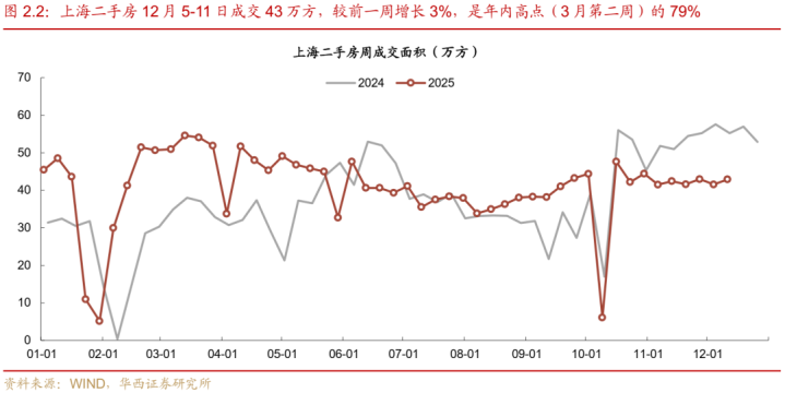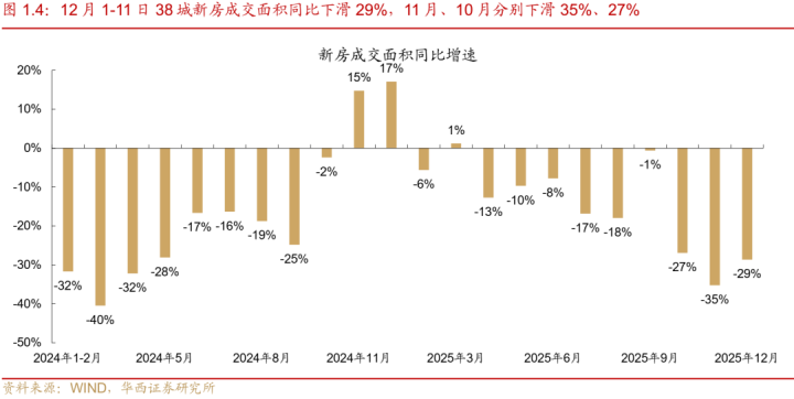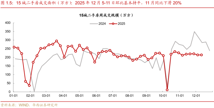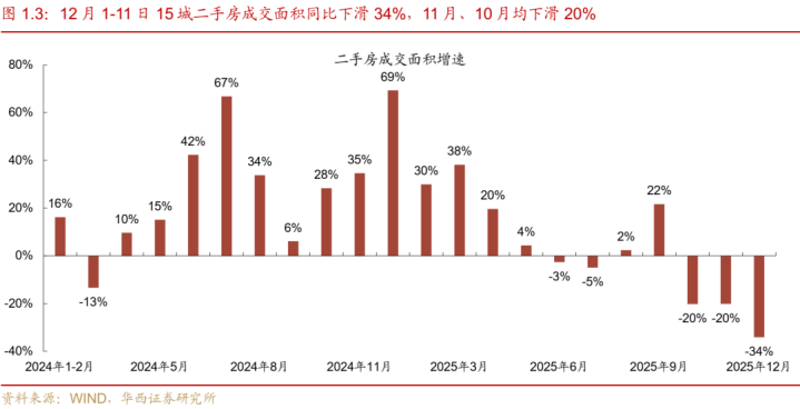 新房降幅边际收敛,二手房景气度短期承压。12月1-11日,38城新房成交面积同比下滑29%,较11月全月(-35%)有边际改善,降幅收敛6个百分点,与10月(-27%)表现基本相当。相比新房的边际修复,二手房成交明显走弱。12月1-11日,15城二手房成交同比下滑34%,较10月、11月的跌幅均扩大14个百分点,二手房市场短期仍面临较大的回调压力。
