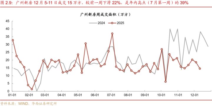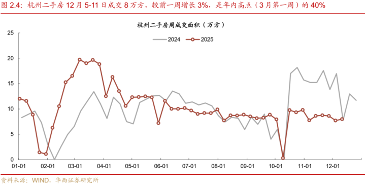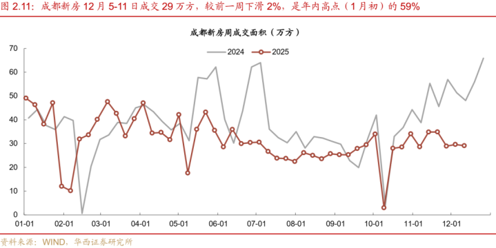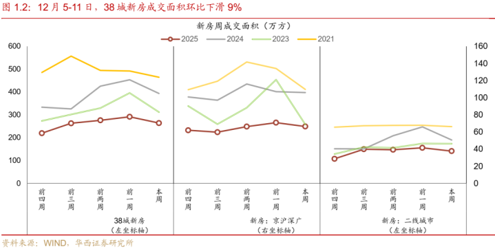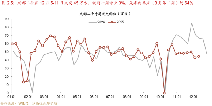 新房成交结束“四连增”,高位回落。本周(12月5-11日),38城新房成交面积录得264万平(约为年内高点的51%),在经历连续四周的环比修复后,本周环比转跌9%。尽管出现单周波动,但绝对规模仍处于近期220-292万平的中枢区间,显示市场在脉冲式回暖后进入整固阶段。