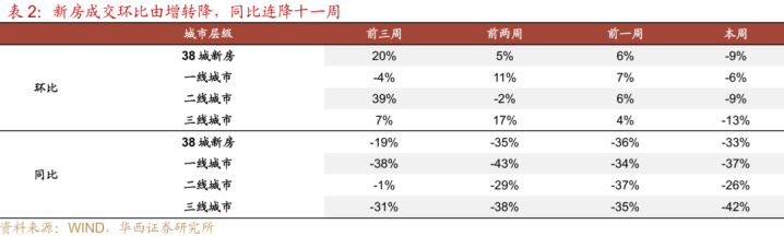 同比降幅边际收敛,磨底特征延续。38城新房成交同比下滑33%,降幅较上周收窄3个百分点,目前已连续十一周录得负增长;15城二手房成交同比降幅亦收敛3个百分点至34%,连续九周同比负增长。